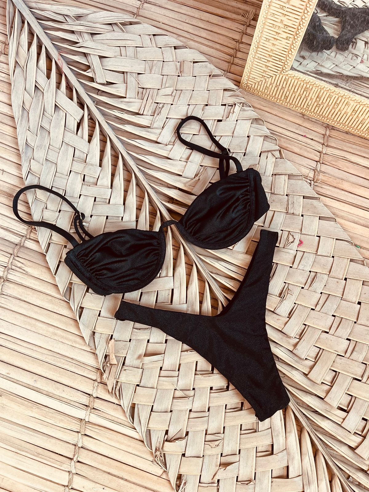 Características: Tecido lurex brilhoso é um tecido mais fino porém não fica transparente pois é todo forrado com o próprio tecido. Biquíni sutiã com aro e calcinha asa delta fina atrás e na lateral, perfeito para sua marquinha. Não acompanha bojo. ( sutiã e calcinha possuem elástico embutido para sustentar melhor a peça )